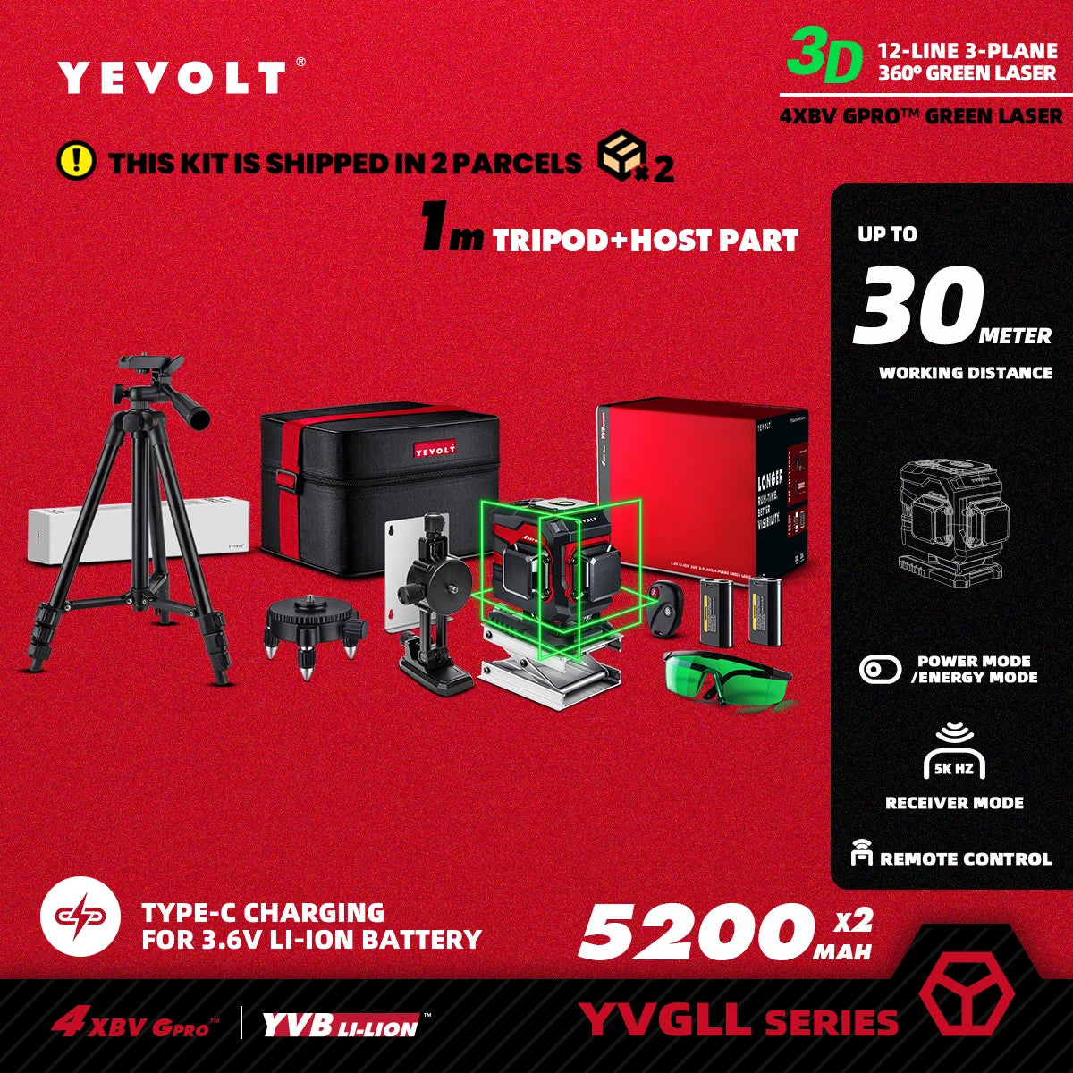 Nivel láser verde YEVOLT de 3/4 planos, serie TL-YVGLL4XS, 12/16 líneas, autonivelante, 360°, 3D/4D, herramienta de medición eléctrica, trípode de 1 m