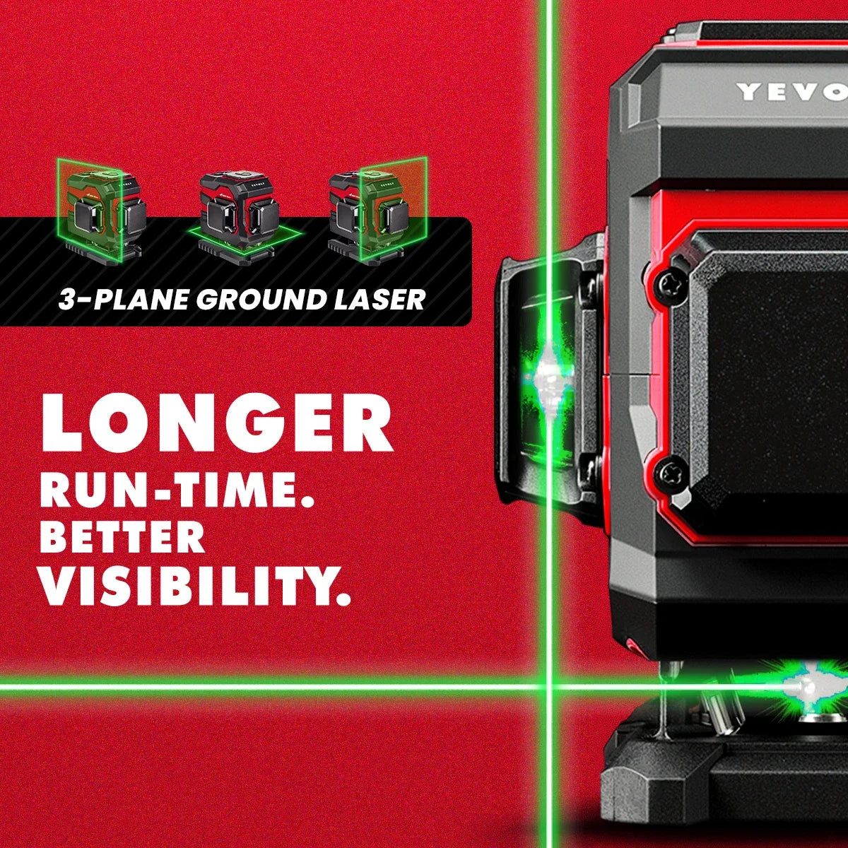 YEVOLT YVGLL4XS12T™ es un nivel láser verde de 3 planos optimizado para el suelo con proyección de piso mejorada, diseñado para colocación de baldosas, vertido de hormigón y calibración de pendientes en construcción y paisajismo.