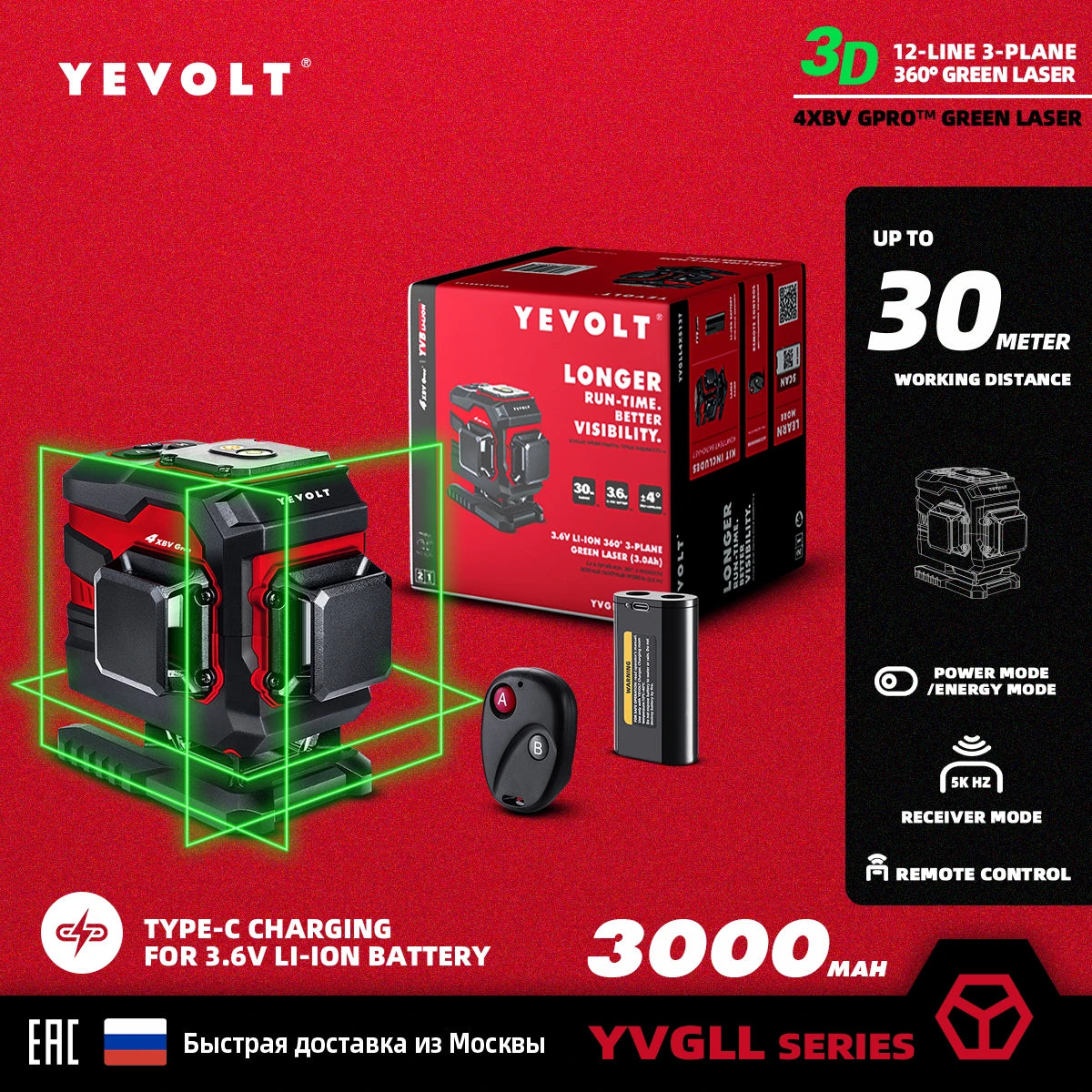 Nivel láser YEVOLT verde de 12/16 líneas, autonivelante, 3/4 planos, 360°, herramienta de medición 3D/4D, trípode de aluminio de 1,5 m, serie YVGLL4XS