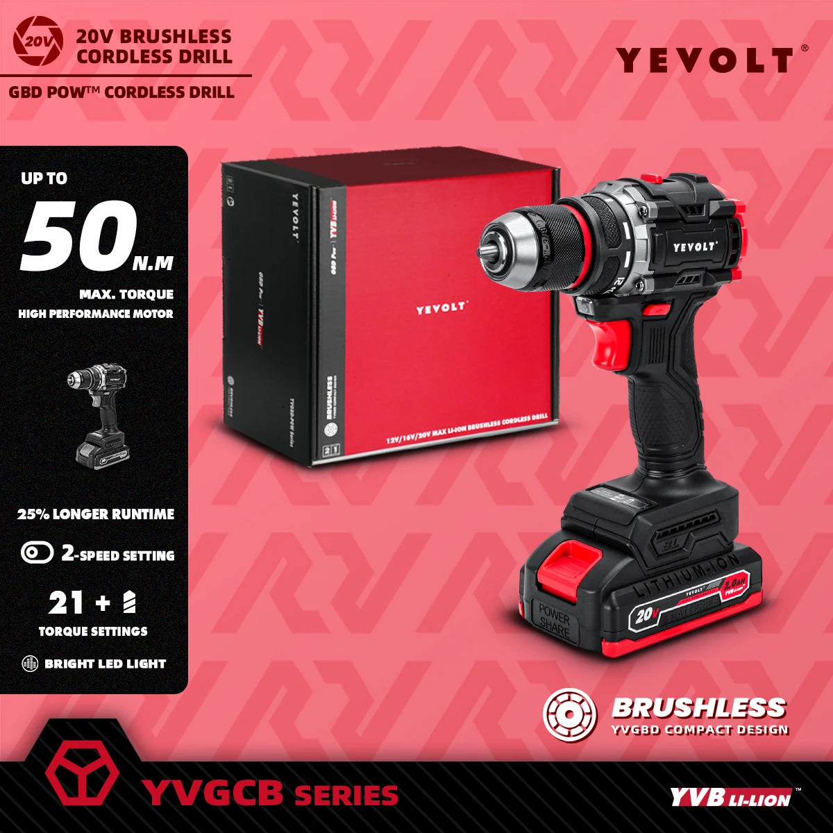 Taladro atornillador inalámbrico YEVOLT YVGBD20DU2 de 20 V con mayor autonomía, sin escobillas, 50 Nm máx., ajuste de par 21+1, mandril autoajustable