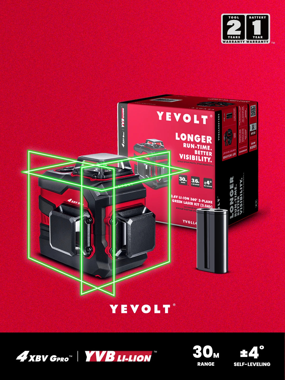 YEVOLT YVGLL4XS12 Nivel láser de 3 planos con haz verde, 12 líneas, 3D, autonivelante horizontal y vertical.