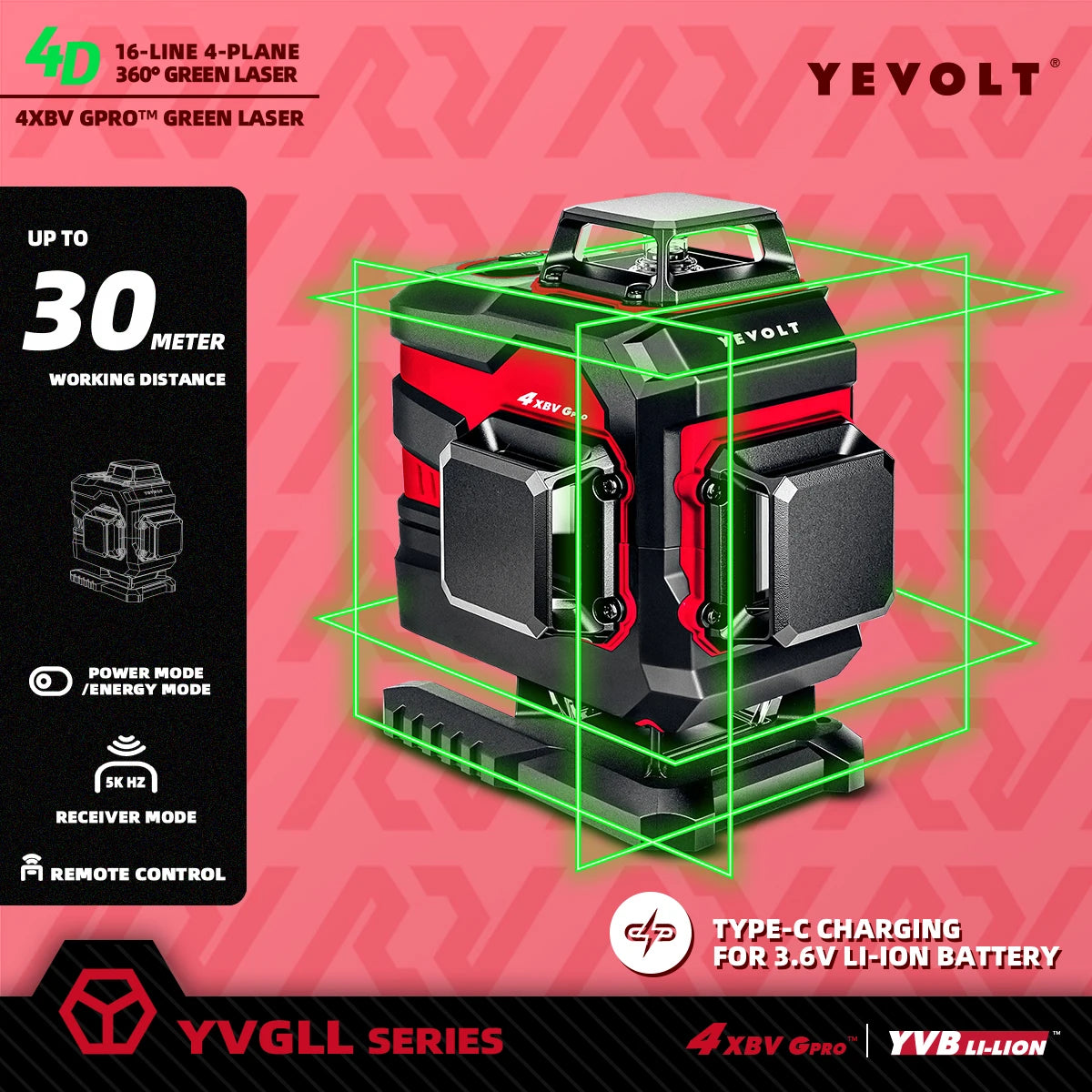 YEVOLT YVGLL4XS16 Nivel láser de 16 líneas TriPlane, plomada y nivel, agrupación inteligente de líneas, diseño de pisos, alta precisión, cobertura de 30 m