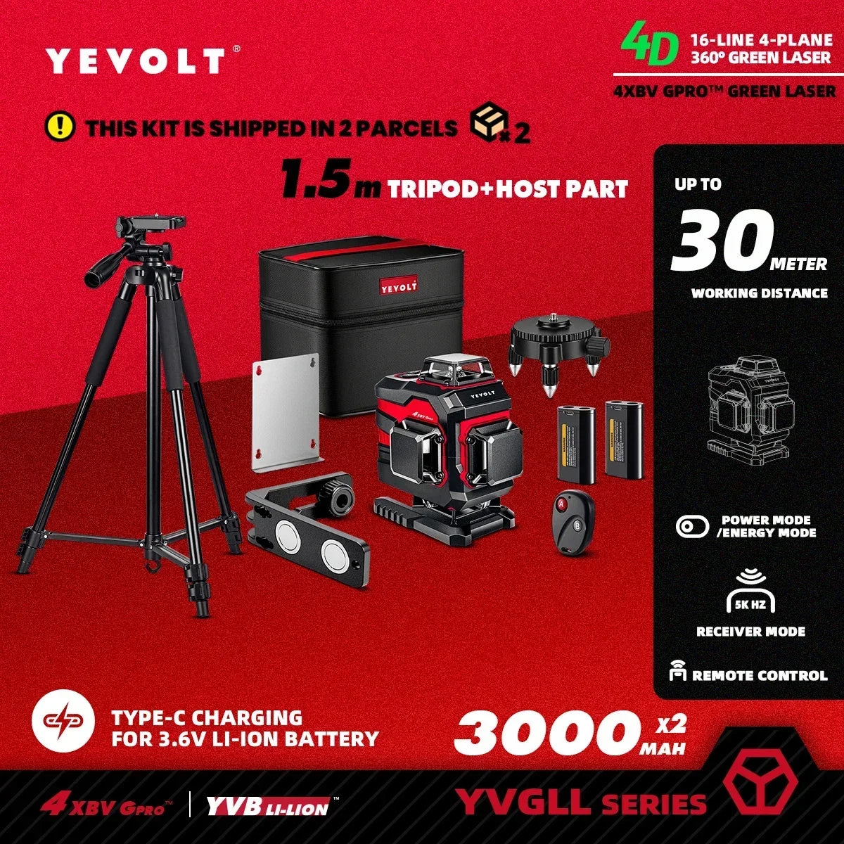 Generador de nivel láser de espectro completo YEVOLT YVGLL4XS16 de 4 planos y 16 líneas para marcado de pisos de almacén de alta precisión con alcance de trabajo de 30 m