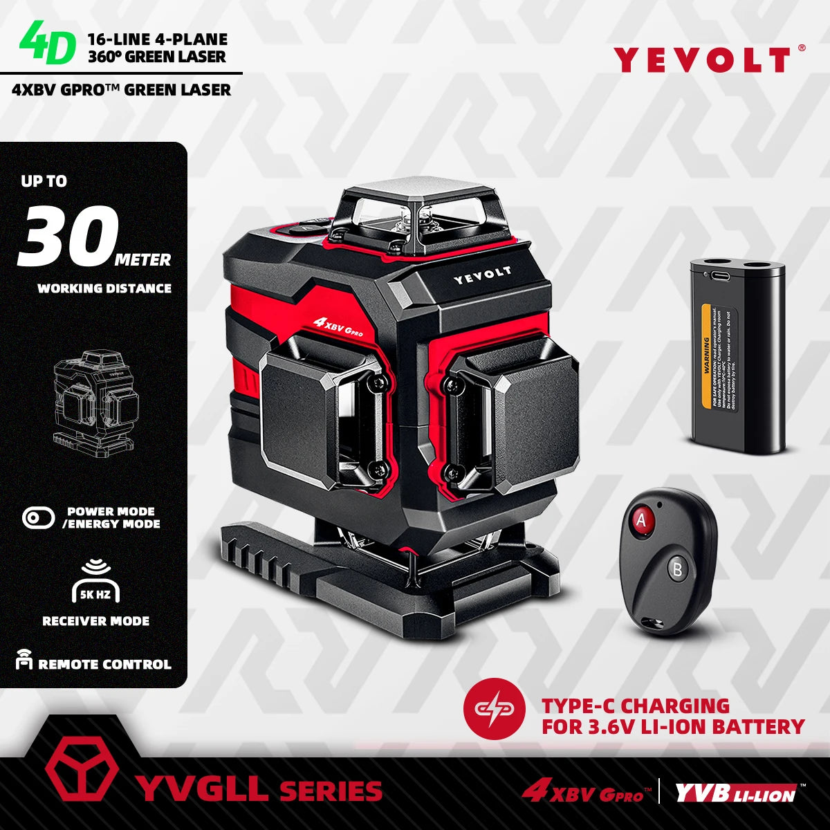 Generador de nivel láser YEVOLT YVGLL4XS16 de 4 planos y 16 líneas, ±4°, autonivelante, alta precisión, para marcado de pisos de almacén, alcance de trabajo de 30 m