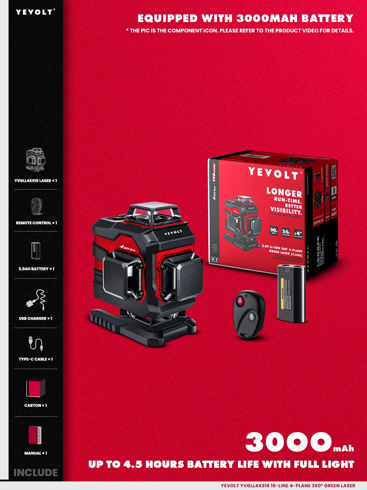 Nivel láser verde YEVOLT YVGLL4XS16, 4 planos, 16 líneas, autonivelante, 360°, 4D, horizontal y vertical, 3,6 V, 3 Ah, herramientas de medición eléctricas