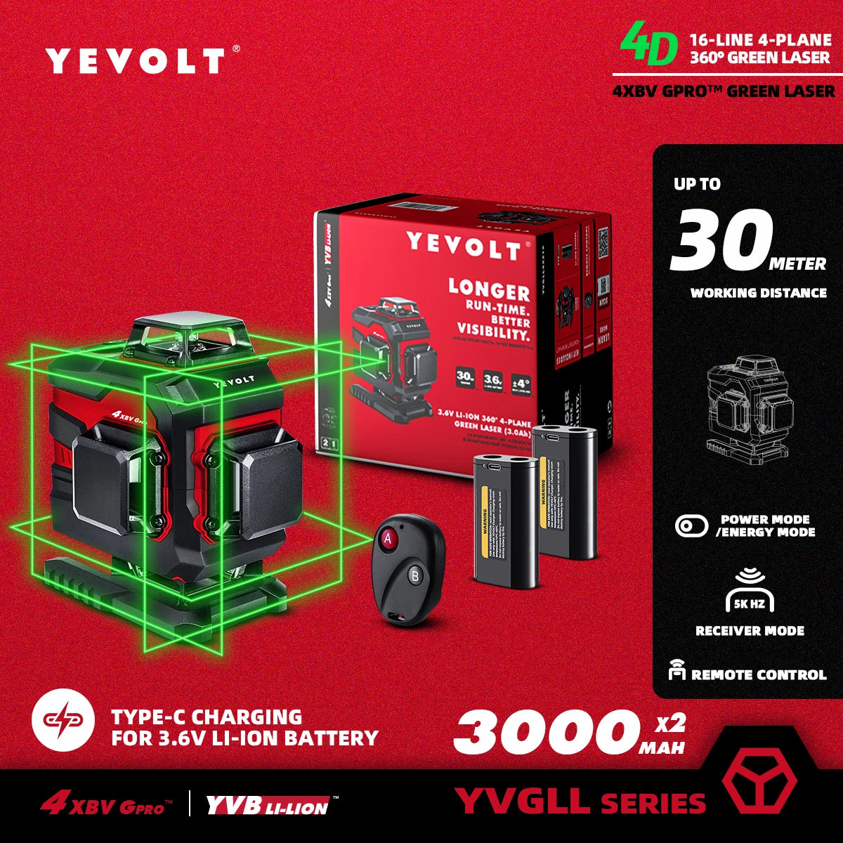 Nivel láser verde YEVOLT YVGLL4XS16DP de 4 planos, 4D, 16 líneas, autonivelación, herramientas de medición horizontales y verticales para trabajo continuo.