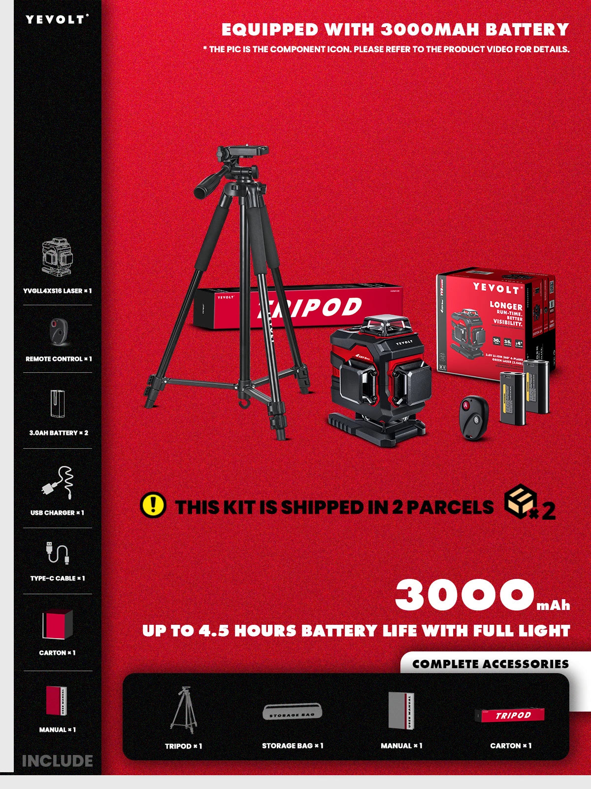 TP-YVGLL4XS16DP Incluye : Nivel láser de 4 planos YVGLL4XS16, Trípode láser YVTRP150 de 1,5 m, 2 baterías de litio YVB30L de 3,0 Ah, control remoto YVLL3DRCB1, cargador YVLL3DCH3, cable de alimentación tipo C, manual del usuario y caja de embalaje.