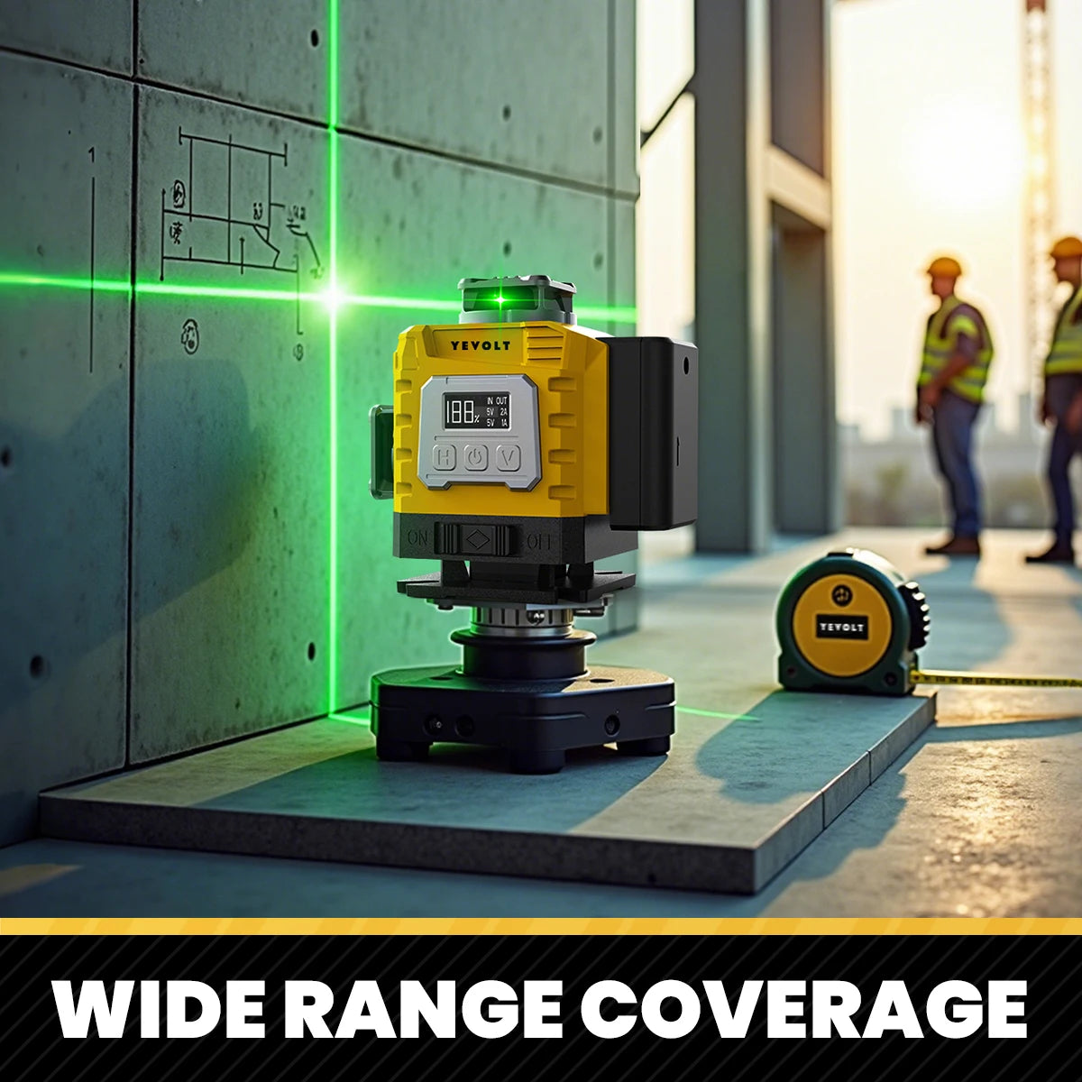 Nivel láser YEVOLT YVGLL4XS16G de 16 líneas con flash estroboscópico para seguimiento láser, ventana giratoria de 360°, base metálica y botones táctiles.