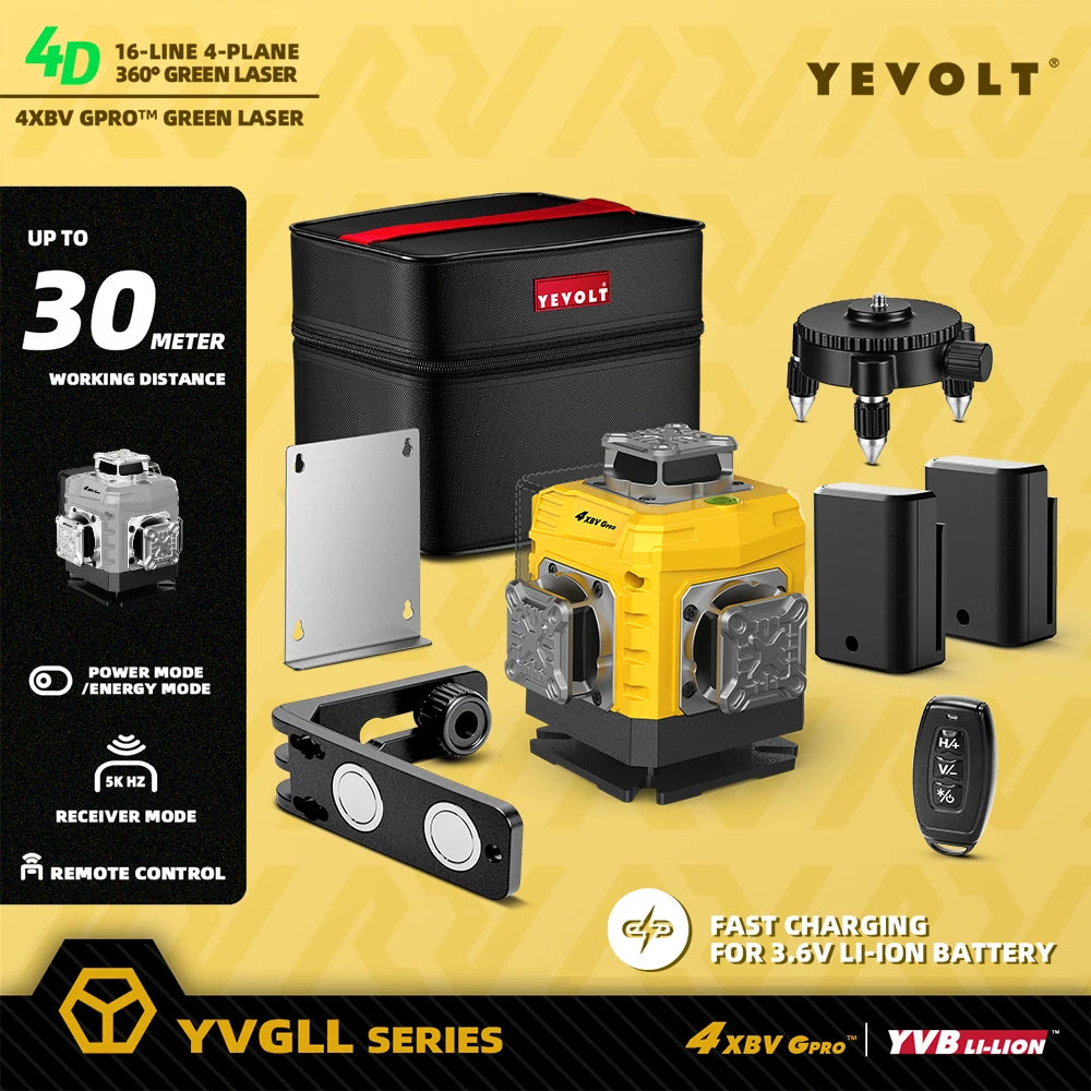 Nivel láser YEVOLT YVGLL4XS16G de 16 líneas: flash estroboscópico para seguimiento láser, modo ecológico y visualización de batería. Autonivelación para trabajos rápidos.