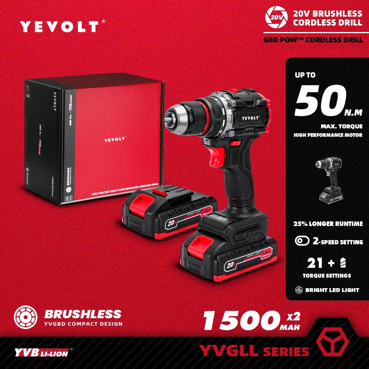 YEVOLT YVGBD20DU2 20V Energy Saving Brushless Cordless Screwdriver Drill 450 in-lbs/50N.m 21+1 Torque Setting Hardened Chuck