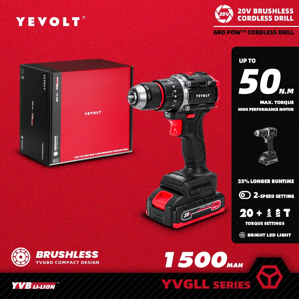 YEVOLT YVGBD20DU2 20V Energy Saving Brushless Cordless Screwdriver Drill 450 in-lbs/50N.m 21+1 Torque Setting Hardened Chuck