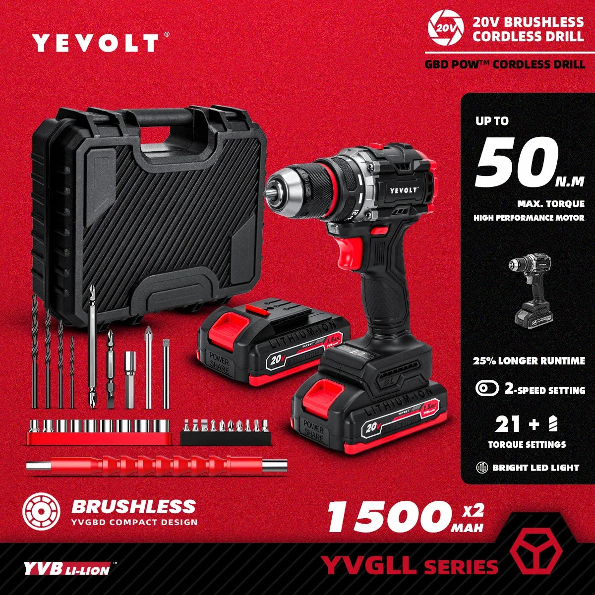 YEVOLT YVGBD20DU2 20V Energy Saving Brushless Cordless Screwdriver Drill 450 in-lbs/50N.m 21+1 Torque Setting Hardened Chuck