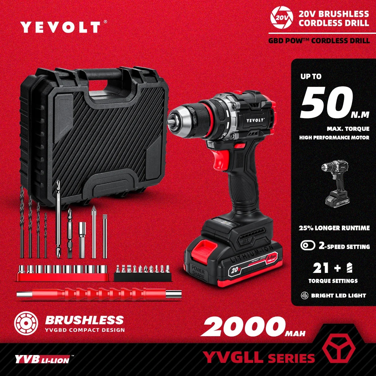 YEVOLT YVGBD20DU2 20V Energy Saving Brushless Cordless Screwdriver Drill 450 in-lbs/50N.m 21+1 Torque Setting Hardened Chuck