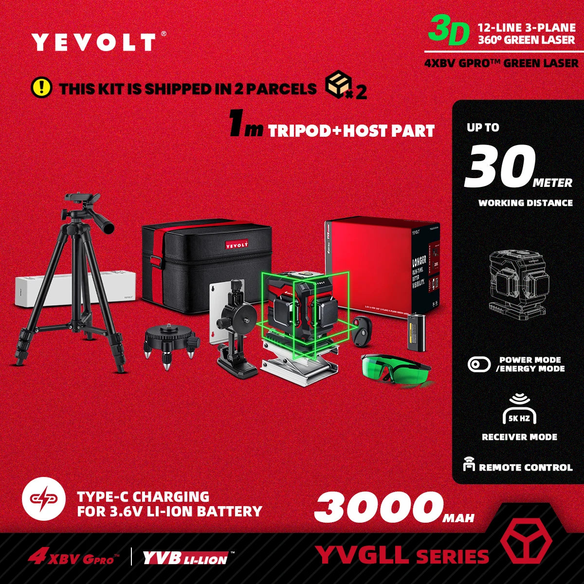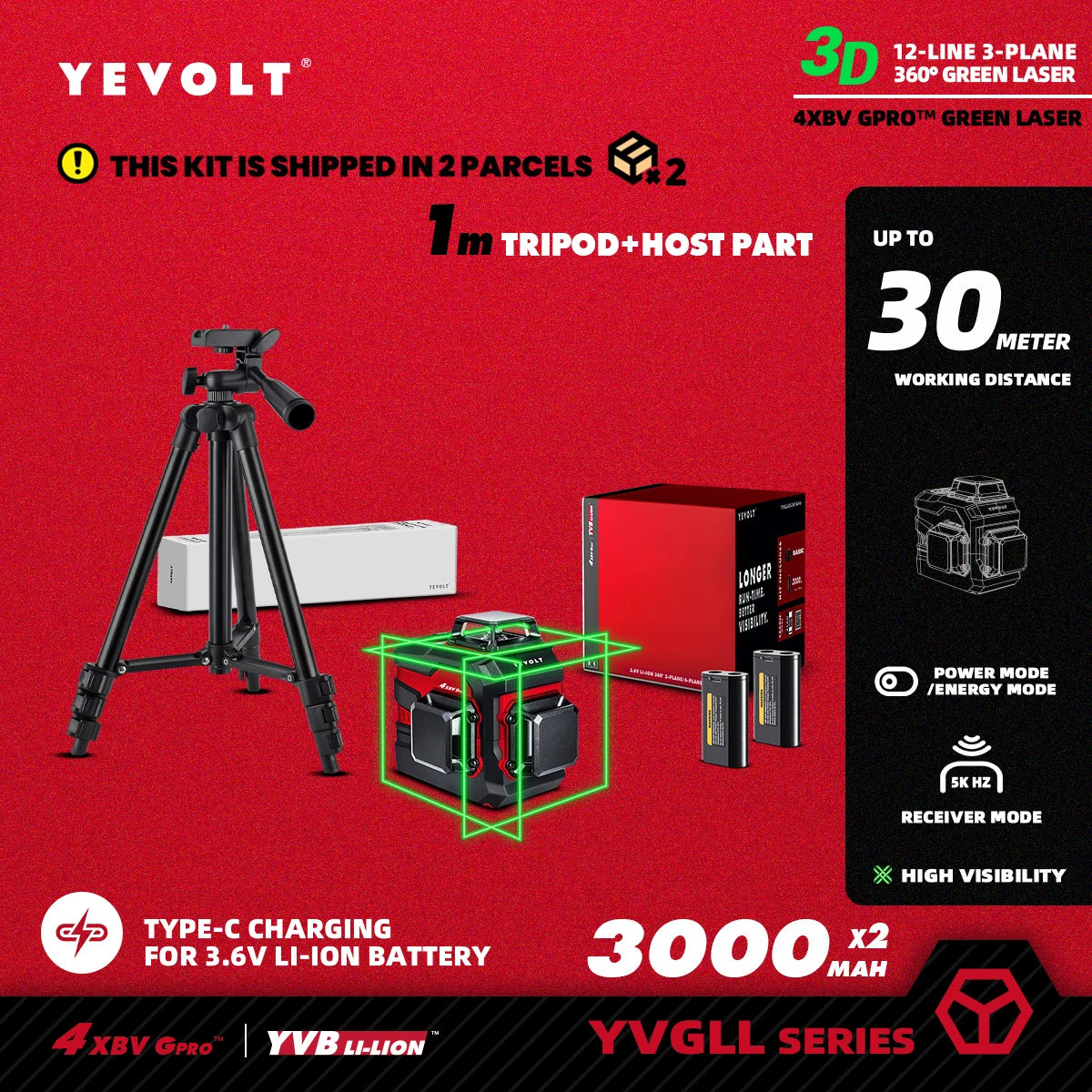 Nível a laser verde YEVOLT TL-YVGLL4XS-Series 3/4-Plano 12/16-Linhas Autonivelante 360 3D/4D Ferramenta de medição de potência - Tripé de 1 m