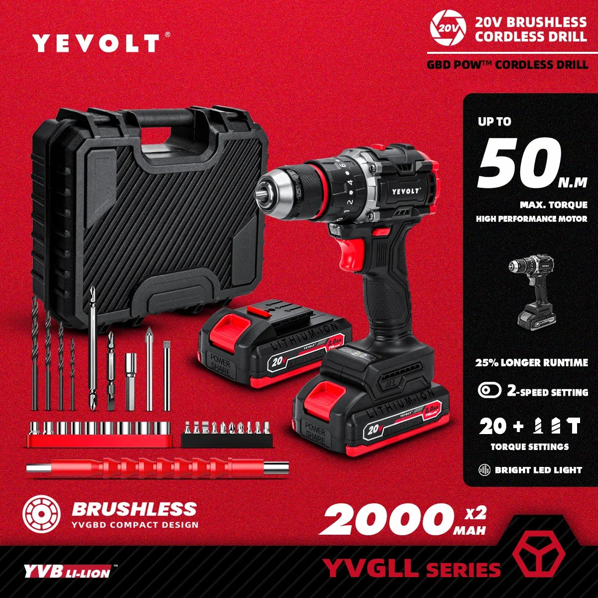 Parafusadeira sem fio YEVOLT YVGBD20DU2 20V, economia de energia, sem escovas, 450 pol.-lbs/50N.m, ajuste de torque 21+1, mandril temperado