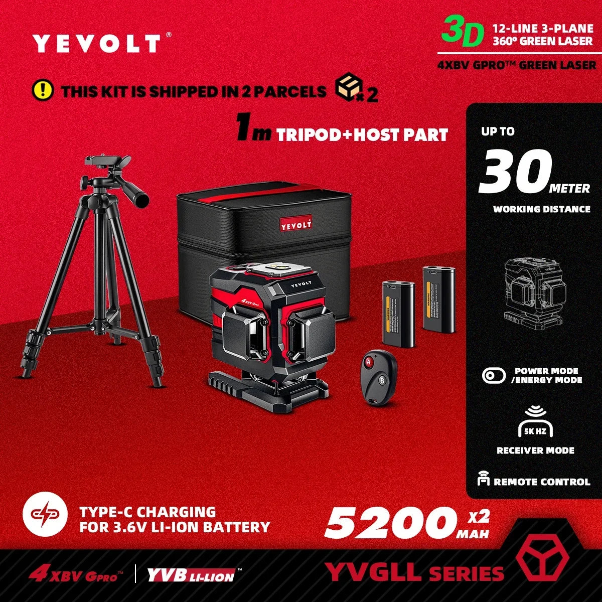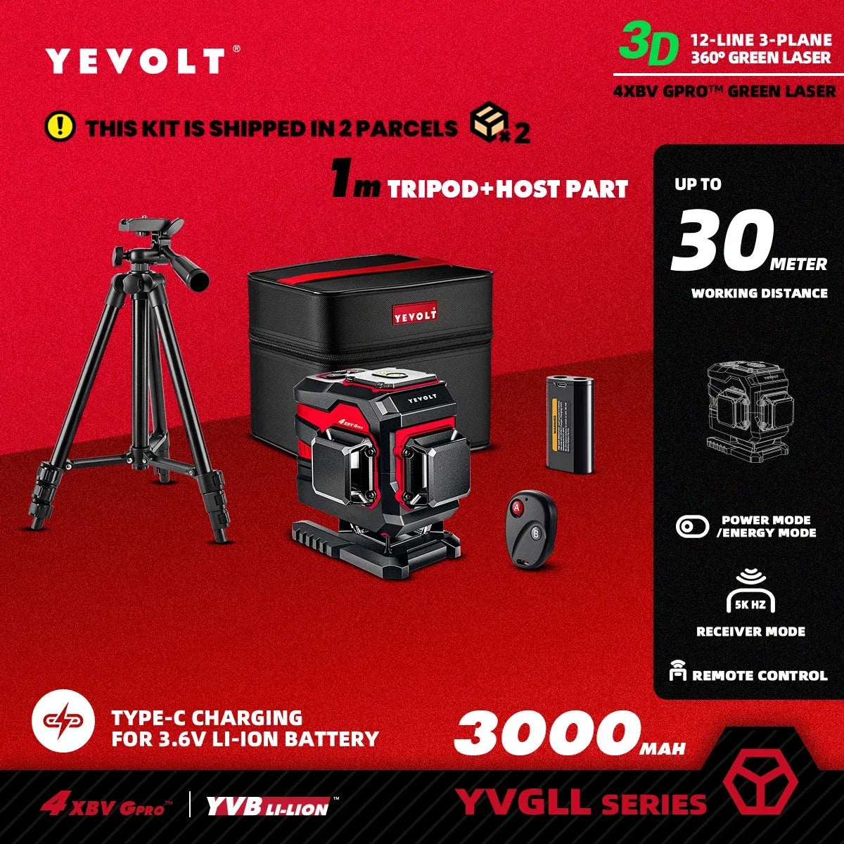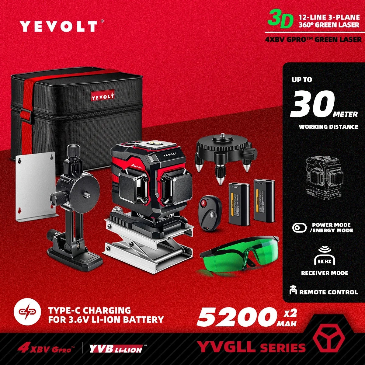 Nível a laser de 360° x3, 12 linhas, YEVOLT YVGLL4XS12T, autonivelante IP54, para abertura de valas e tubulação, alta precisão, 30 m de longo alcance