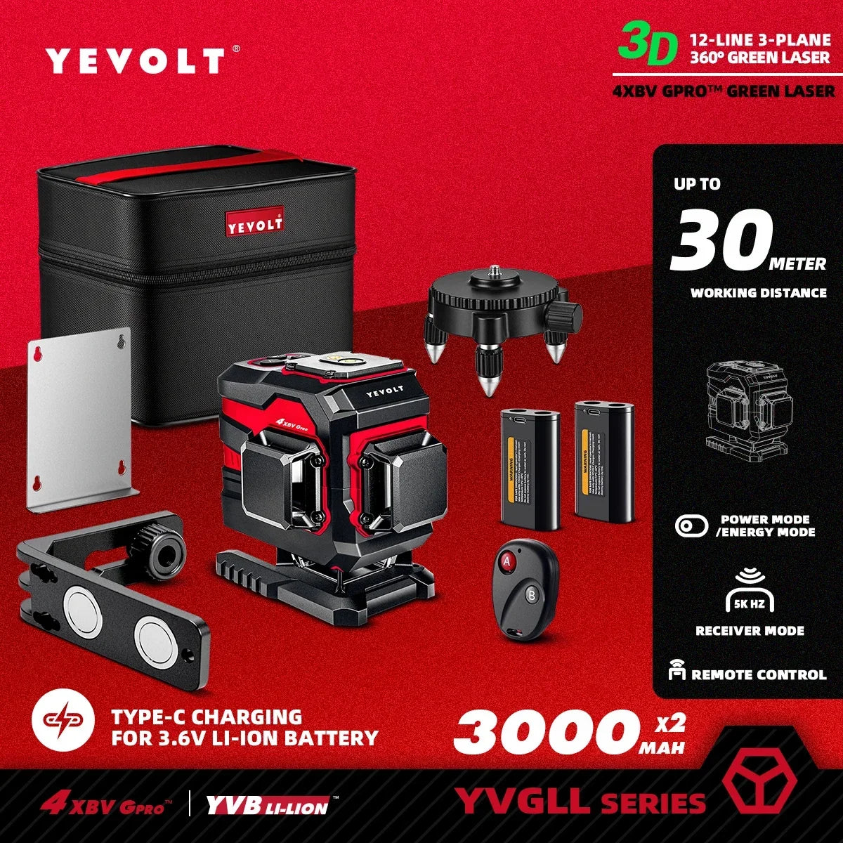 Nível a laser de 360° x3, 12 linhas, YEVOLT YVGLL4XS12T, autonivelante IP54, para abertura de valas e tubulação, alta precisão, 30 m de longo alcance