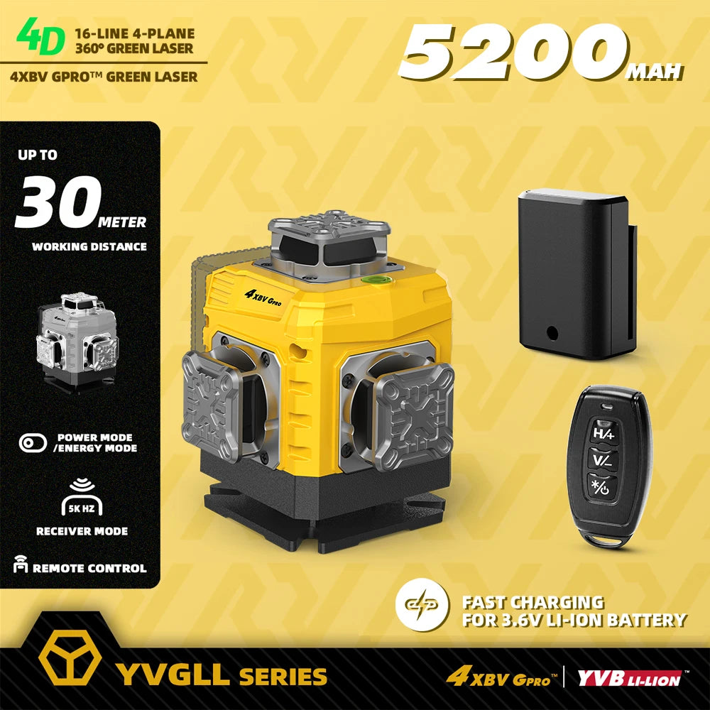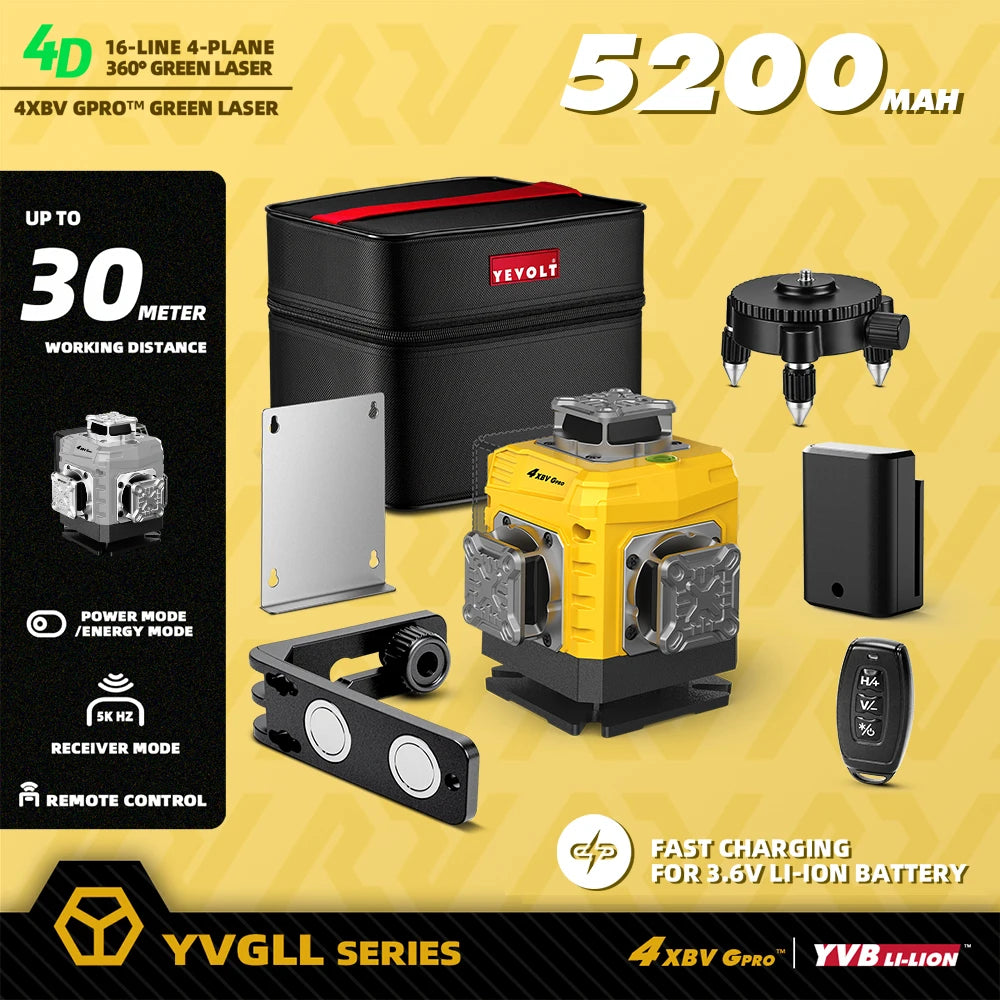 Gerador de nível a laser autonivelante YEVOLT YVGLL4XS16 de 4 planos e 16 linhas com ±4° para marcação de pisos de armazém, alta precisão, alcance de trabalho de 30 m