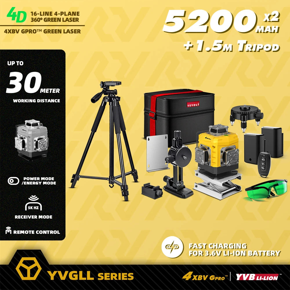 Nível a laser YEVOLT YVGLL4XS16G de 16 linhas - Janela superior giratória de 360°, botões de toque e base de metal para alinhamento em vários ângulos