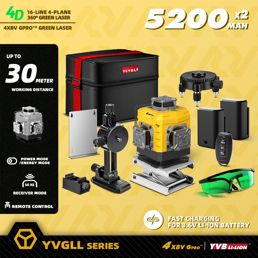 Nível a laser YEVOLT YVGLL4XS16G de 16 linhas - Janela superior giratória de 360°, botões de toque e base de metal para alinhamento em vários ângulos