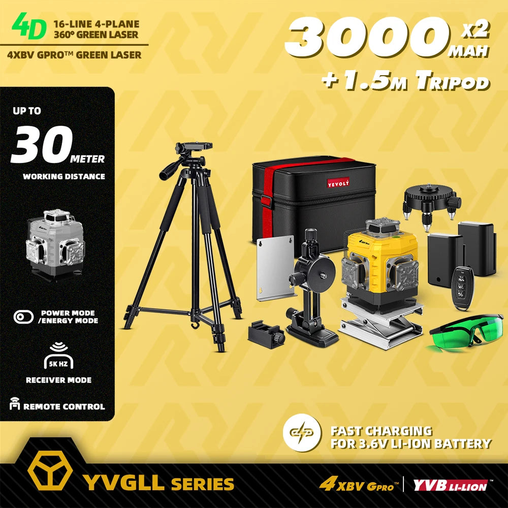 Flash estroboscópico de nível a laser YEVOLT YVGLL4XS16G de 16 linhas para rastreamento a laser, janela giratória de 360°, base de metal e botões de toque